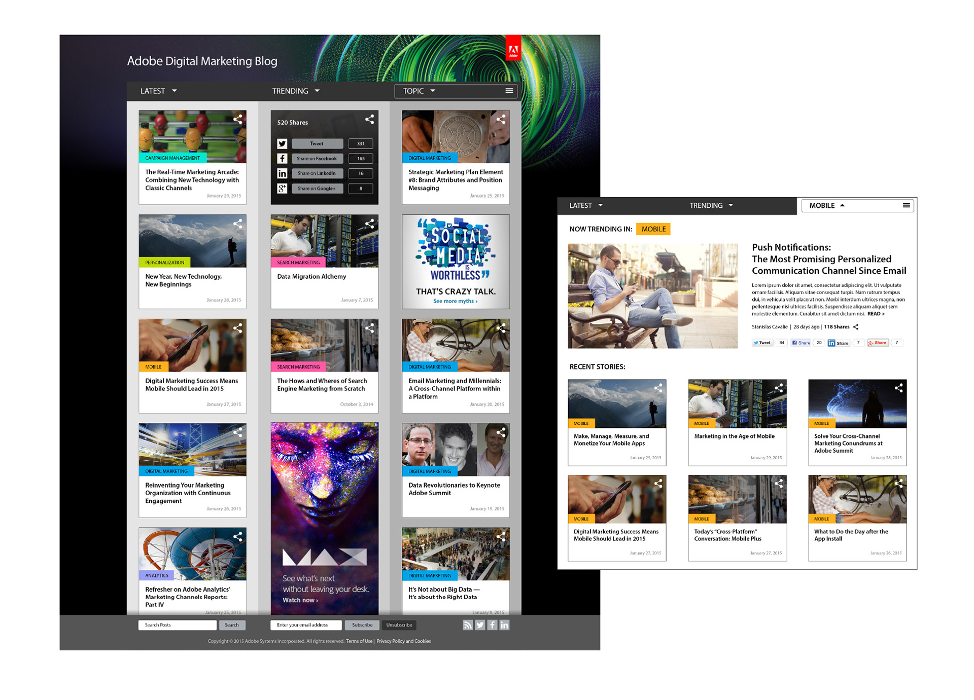 Adobe maintains several blog sites for different aspects of their business. This redesign concept was commissioned and paid for by Adobe in 2015, but was never implemented on the live site.